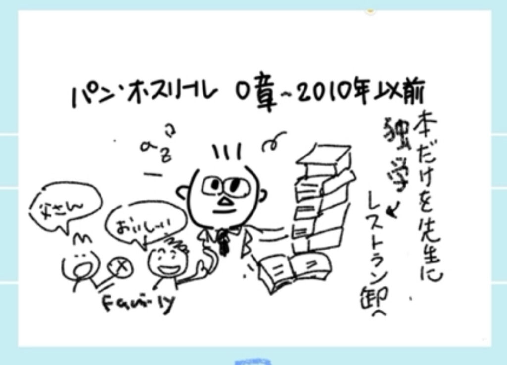 サラリーマン時代、転勤に伴い、有名なパン屋さんのマネジメントをすることになった店主。「パンの作り方がわかったら、仕事に役立つかもしれない」と、明け方から厨房の見学をしているうちに、自分でも作ってみようと思い立つ。